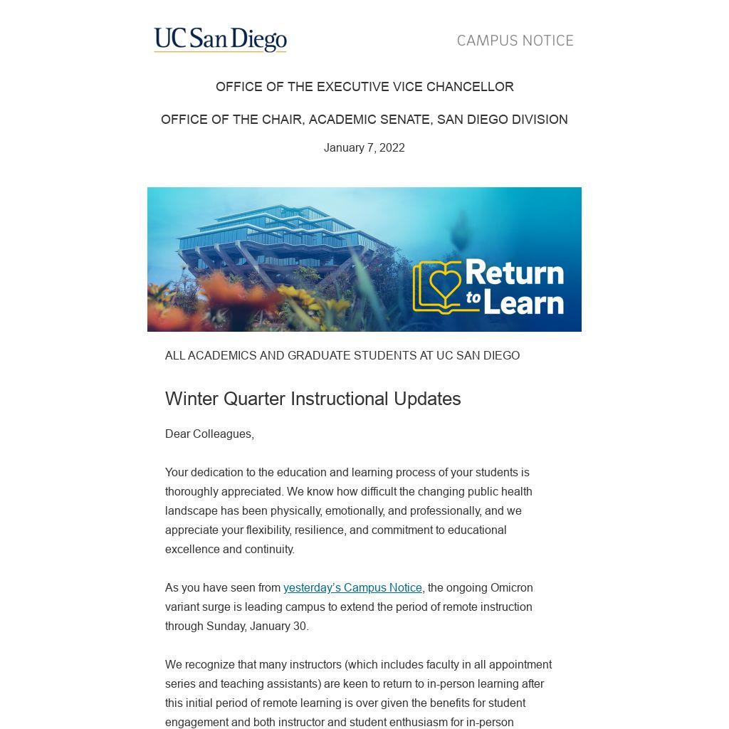 Given the unusual circumstances, the Educational Policy Committee of the Academic Senate granted an emergency limited-term exception to the Policy on Distance Education Courses on January 6, to allow any course to be taught remotely for this quarter, without requiring instructors to request any additional approvals from the Administration or Senate. This means that all instructors will have the flexibility to continue teaching in a mixed in-person/remote modality or in a remote modality for the remainder of the Winter 2022 quarter.