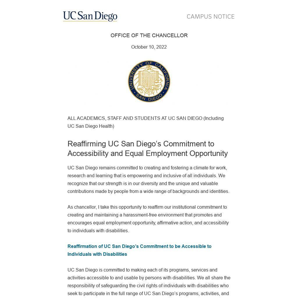 Reaffirming UC San Diego’s Commitment to Accessibility and Equal Employment Opportunity