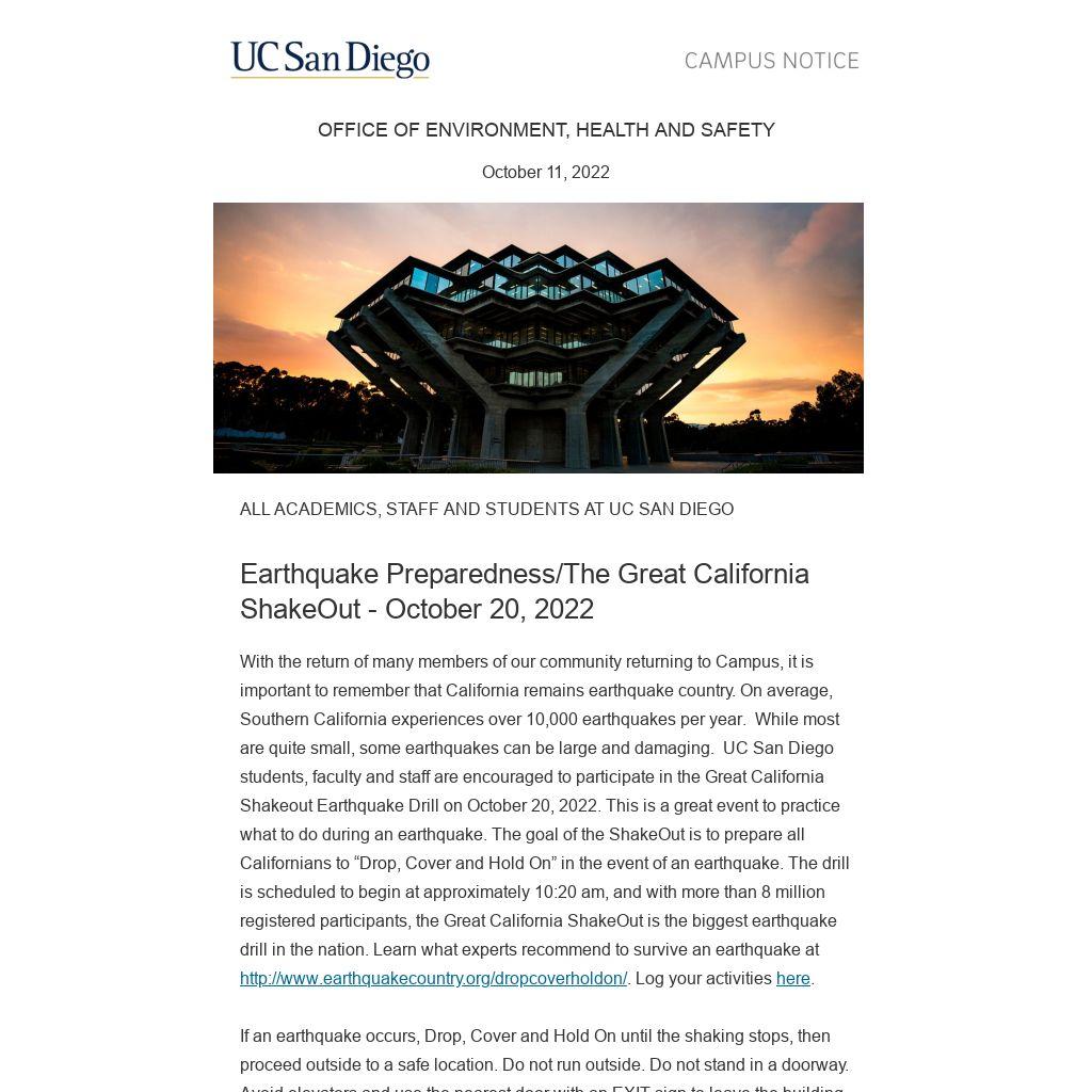 With the return of many members of our community returning to Campus, it is important to remember that California remains earthquake country. On average, Southern California experiences over 10,000 earthquakes per year. While most are quite small, some earthquakes can be large and damaging. UC San Diego students, faculty and staff are encouraged to participate in the Great California Shakeout Earthquake Drill on October 20, 2022. This is a great event to practice what to do during an earthquake. The goal of the ShakeOut is to prepare all Californians to “Drop, Cover and Hold On” in the event of an earthquake. The drill is scheduled to begin at approximately 10:20 am, and with more than 8 million registered participants, the Great California ShakeOut is the biggest earthquake drill in the nation. Learn what experts recommend to survive an earthquake at http://www.earthquakecountry.org/dropcoverholdon/. Log your activities here.