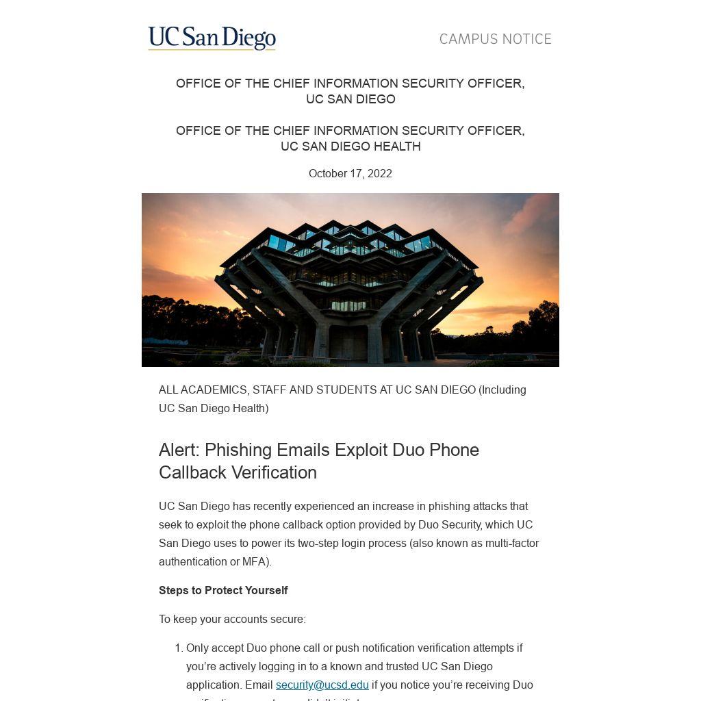 UC San Diego has recently experienced an increase in phishing attacks that seek to exploit the phone callback option provided by Duo Security, which UC San Diego uses to power its two-step login process (also known as multi-factor authentication or MFA).