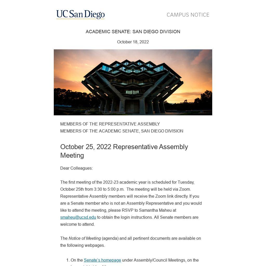 Committee on Planning and Budget Chair Michael Provence and Executive Director of Triton Auxiliary Programs & Services Josh Kavanagh will update Assembly on the transit pass program and Vice Chancellor for Student Affairs Alysson Satterlund, Executive Director of Student Health and Well-Being Susan Fila, and Director of Student Affairs Case Management Andrew Hua will provide information on support services for students in distress. In addition, the following proposals will be presented:
