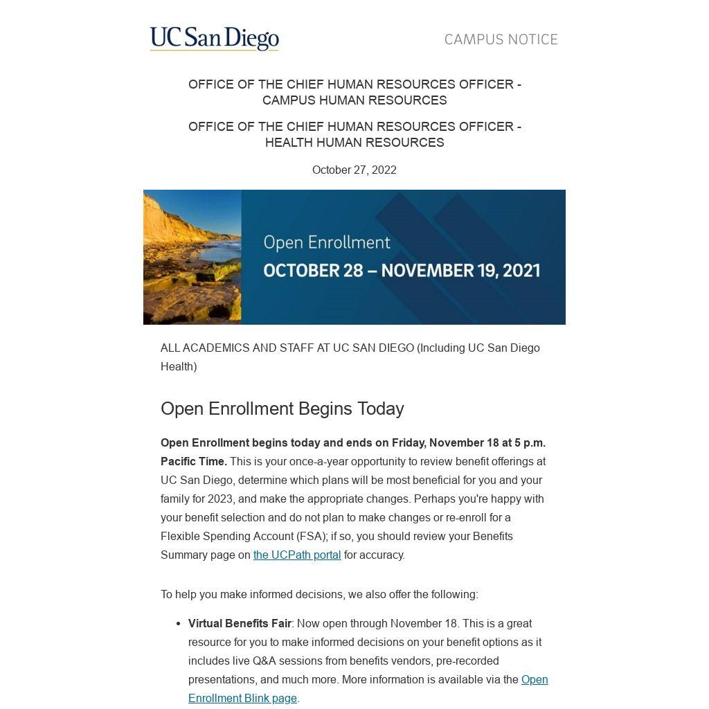 Open Enrollment begins today and ends on Friday, November 18 at 5 p.m. Pacific Time. This is your once-a-year opportunity to review benefit offerings at UC San Diego, determine which plans will be most beneficial for you and your family for 2023, and make the appropriate changes. Perhaps you're happy with your benefit selection and do not plan to make changes or re-enroll for a Flexible Spending Account (FSA); if so, you should review your Benefits Summary page on the UCPath portal for accuracy.