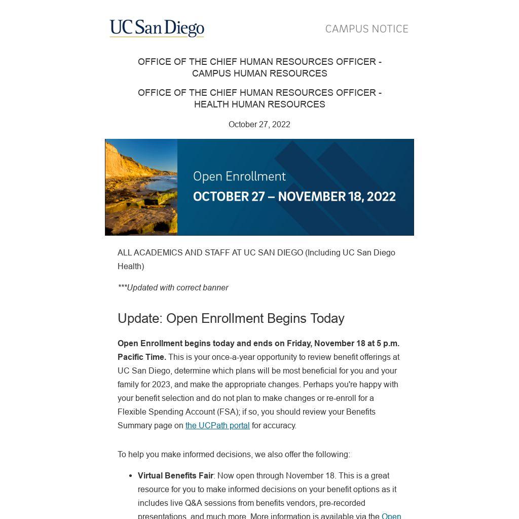 Open Enrollment begins today and ends on Friday, November 18 at 5 p.m. Pacific Time. This is your once-a-year opportunity to review benefit offerings at UC San Diego, determine which plans will be most beneficial for you and your family for 2023, and make the appropriate changes. Perhaps you're happy with your benefit selection and do not plan to make changes or re-enroll for a Flexible Spending Account (FSA); if so, you should review your Benefits Summary page on the UCPath portal for accuracy.