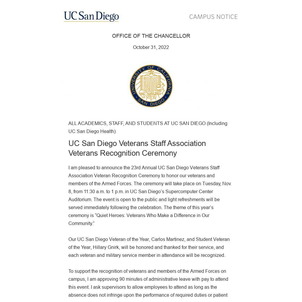 I am pleased to announce the 23rd Annual UC San Diego Veterans Staff Association Veteran Recognition Ceremony to honor our veterans and members of the Armed Forces. The ceremony will take place on Tuesday, Nov. 8, from 11:30 a.m. to 1 p.m. in UC San Diego’s Supercomputer Center Auditorium. The event is open to the public and light refreshments will be served immediately following the celebration. The theme of this year’s ceremony is “Quiet Heroes: Veterans Who Make a Difference in Our Community.”