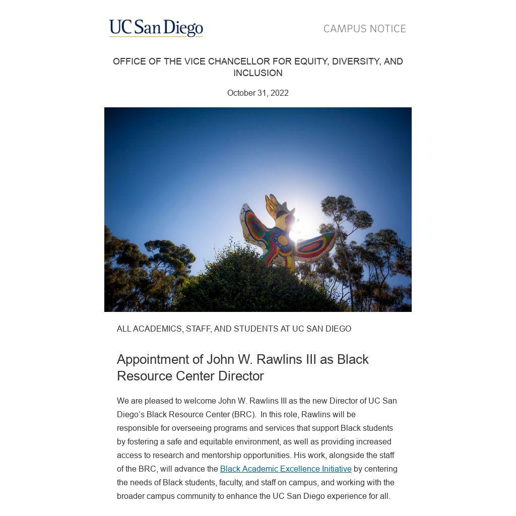 We are pleased to welcome John W. Rawlins III as the new Director of UC San Diego’s Black Resource Center (BRC). In this role, Rawlins will be responsible for overseeing programs and services that support Black students by fostering a safe and equitable environment, as well as providing increased access to research and mentorship opportunities. His work, alongside the staff of the BRC, will advance the Black Academic Excellence Initiative by centering the needs of Black students, faculty, and staff on campus, and working with the broader campus community to enhance the UC San Diego experience for all.