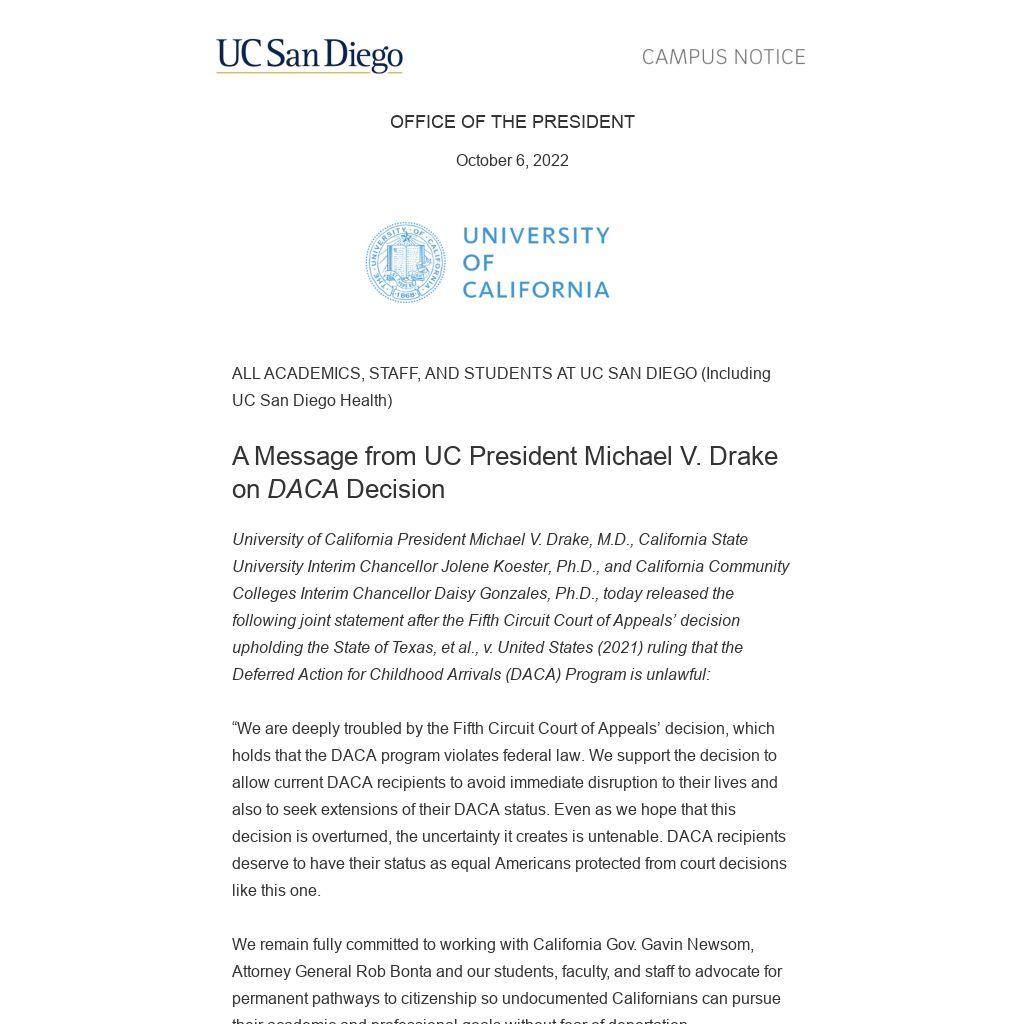 A Message from UC President Michael V. Drake on DACA Decision | |