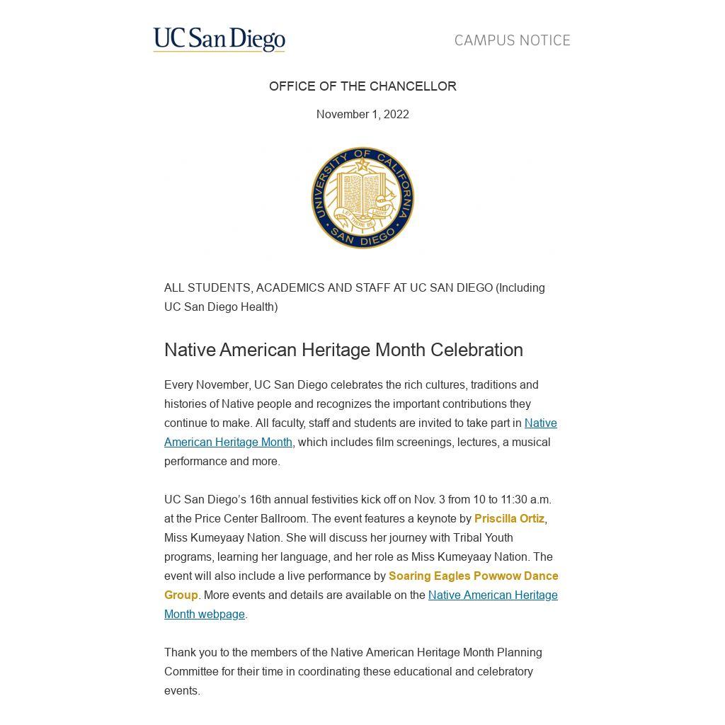 UC San Diego’s 16th annual festivities kick off on Nov. 3 from 10 to 11:30 a.m. at the Price Center Ballroom. The event features a keynote by Priscilla Ortiz, Miss Kumeyaay Nation. She will discuss her journey with Tribal Youth programs, learning her language, and her role as Miss Kumeyaay Nation. The event will also include a live performance by Soaring Eagles Powwow Dance Group. More events and details are available on the Native American Heritage Month webpage.