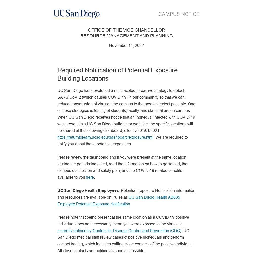 UC San Diego has developed a multifaceted, proactive strategy to detect SARS CoV-2 (which causes COVID-19) in our community so that we can reduce transmission of virus on the campus to the greatest extent possible. One of these strategies is testing of students, faculty, and staff that are on campus. When UC San Diego receives notice that an individual infected with COVID‐19 was present in a UC San Diego building or worksite, the specific locations will be shared at the following dashboard, effective 01/01/2021: https://returntolearn.ucsd.edu/dashboard/exposure.html. We are required to notify you about these potential exposures.