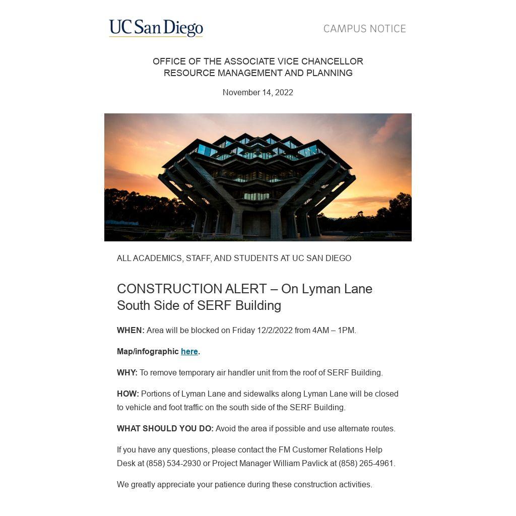 HOW: Portions of Lyman Lane and sidewalks along Lyman Lane will be closed to vehicle and foot traffic on the south side of the SERF Building.