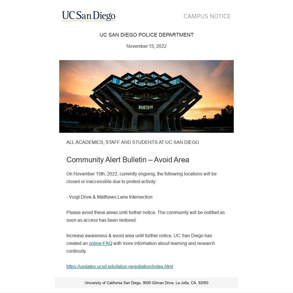 Increase awareness & avoid area until further notice. UC San Diego has created an online FAQ with more information about learning and research continuity.