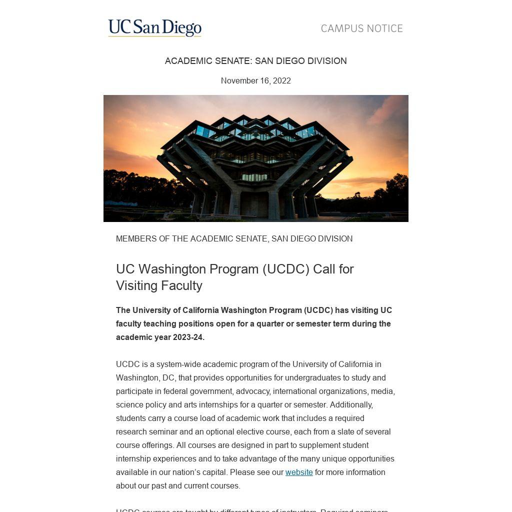 The University of California Washington Program (UCDC) has visiting UC faculty teaching positions open for a quarter or semester term during the academic year 2023-24. UCDC is a system-wide academic program of the University of California in Washington, DC, that provides opportunities for undergraduates to study and participate in federal government, advocacy, international organizations, media, science policy and arts internships for a quarter or semester. Additionally, students carry a course load of academic work that includes a required research seminar and an optional elective course, each from a slate of several course offerings. All courses are designed in part to supplement student internship experiences and to take advantage of the many unique opportunities available in our nation’s capital. Please see our website for more information about our past and current courses. UCDC courses are taught by different types of instructors. Required seminars are taught usually by full-time UCDC associate directors. Electives are taught largely by instructors who are local experts in their fields and by UC faculty visiting for a single quarter or semester. We typically have one or two visiting UC faculty teaching at any one time. Quarter and semester visiting positions are filled as needed to meet the curricular needs of the program, which may vary from year to year. Generally, areas of specialization include Political Science, International Relations, Economics, Sociology, History, Anthropology, Public Policy, Area Studies, Media, Law, Science Policy and Performing/Fine Arts. Appointments are usually for one term though longer periods may be considered. The teaching load for a single term is one quarter or one semester course of 25 students or fewer. These positions are in Washington, DC, at the UC Washington Center, and residency in the DC metro area for the term of the appointment is a requirement. UCDC will provide one round-trip airfare and a nonsmoking, furnished, one-bedroom apartment at the Washington Center for the duration of the appointment. Home departments will be provided course relief for each course taught by the visiting faculty. Interested applicants should submit a letter of interest, a CV, recent teaching evaluations (particularly for small courses, if available), and a relevant course syllabus (or proposal, at least) related to the above areas of specialization. We welcome more than one syllabus as our curricular needs are somewhat variable. Applications will be reviewed on a rolling basis, with a deadline of January 9, 2023. If you have any questions, please contact Dr. Jennifer Diascro, Interim Executive Director, at Jennifer.Diascro@ucdc.edu.