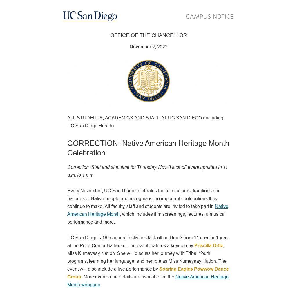 UC San Diego’s 16th annual festivities kick off on Nov. 3 from 11 a.m. to 1 p.m. at the Price Center Ballroom. The event features a keynote by Priscilla Ortiz, Miss Kumeyaay Nation. She will discuss her journey with Tribal Youth programs, learning her language, and her role as Miss Kumeyaay Nation. The event will also include a live performance by Soaring Eagles Powwow Dance Group. More events and details are available on the Native American Heritage Month webpage.