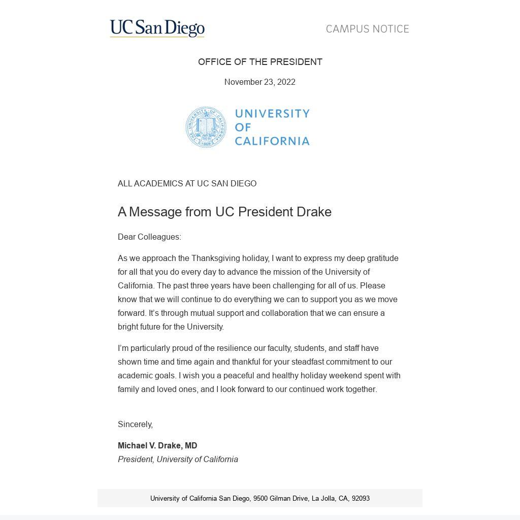 As we approach the Thanksgiving holiday, I want to express my deep gratitude for all that you do every day to advance the mission of the University of California. The past three years have been challenging for all of us. Please know that we will continue to do everything we can to support you as we move forward. It’s through mutual support and collaboration that we can ensure a bright future for the University.