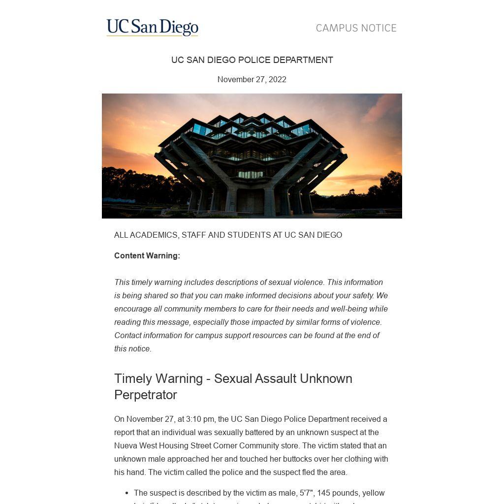 On November 27, at 3:10 pm, the UC San Diego Police Department received a report that an individual was sexually battered by an unknown suspect at the Nueva West Housing Street Corner Community store. The victim stated that an unknown male approached her and touched her buttocks over her clothing with his hand. The victim called the police and the suspect fled the area.