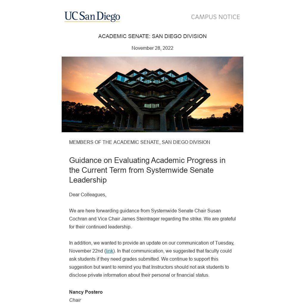 Many faculty looking at the disruption to their classes, their own workload concerns, and their sentiments regarding the strike have asked: “Would cancelling final examinations be acceptable?” Beyond the APM, other rules have been formulated to articulate our responsibilities to our students. For example, the systemwide Regulations of the Academic Senate—the rules of the faculty that we have formulated for ourselves—include the requirement of final examinations (with certain exceptions and carve outs for, e.g., laboratory classes; see Senate Regulation 772). Divisional Senate regulations generally mirror systemwide regulations in this regard. This and similar stipulations are meant to protect students from arbitrary evaluation of their academic work. We must make sure that when we contemplate relaxing our rules under extraordinary circumstances that our best intentions do not have unintentionally harmful consequences. Cancellation of a final exam, for example, may deprive a student of the chance to raise their grade. Making a final exam optional might not. Typically, to vouchsafe fairness, assignments and grading standards need to be spelled out in the course syllabus so that students can plan. In this instance, with the strike coming after distribution of the syllabus, that may present difficulties. When determining how or whether to offer forms of flexibility to students under atypical circumstance, faculty ought to employ the following principles: Do I have enough information to evaluate a student’s performance fairly? Have I provided opportunities to the student to demonstrate that they have learned? At the end of this term, it is entirely possible and even likely that some students will not have had the full experience of a class as it would be taught under normal circumstances. For example, discussion sections run by teaching assistants may have been cancelled and you, the instructor of record, could not or chose not to take on the struck work. This does not necessarily mean that instruction has been insufficient for the purpose of evaluating academic progress and fairly assigning a grade. When in doubt, discuss your plans with your department chair at a minimum.