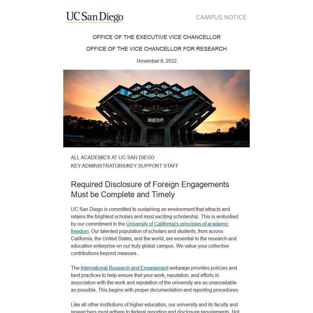 NIH, UC San Diego’s largest federal sponsor, “requires the disclosure of all sources of research support, foreign components, and financial conflicts of interest for senior/key personnel on research applications and awards.”