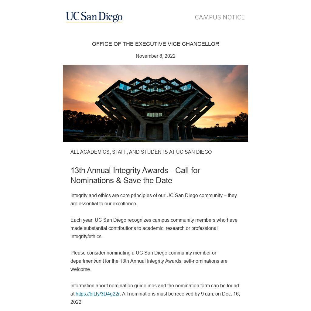 Please consider nominating a UC San Diego community member or department/unit for the 13th Annual Integrity Awards; self-nominations are welcome.