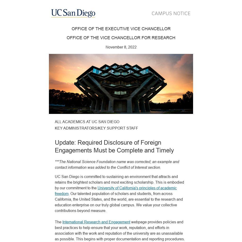 NIH, UC San Diego’s largest federal sponsor, “requires the disclosure of all sources of research support, foreign components, and financial conflicts of interest for senior/key personnel on research applications and awards.”