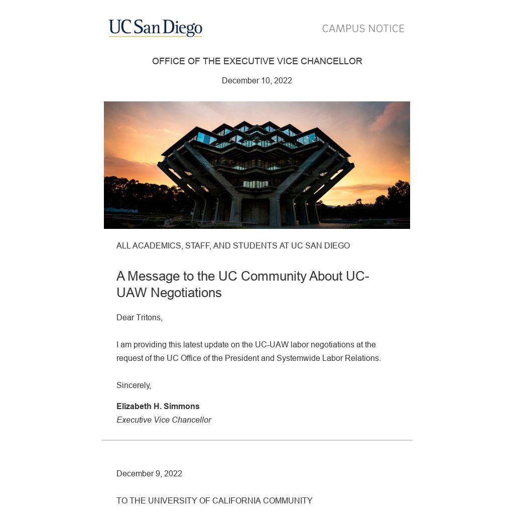 You can be assured that our goal is always to try to achieve agreements by working collaboratively with our union partners at the bargaining table. This is what we have done repeatedly over the past year, as illustrated by the four agreements we’ve achieved with unions representing our lecturers, our nurses, our public safety officers, and our clerical and other administrative staff. In each of these prior negotiations, both sides bargained in good faith, and both sides compromised. Using this same approach, the University was also able to reach tentative agreements with UAW’s postdoctoral scholar and academic researcher units last month; those agreements are awaiting approval by UAW members.