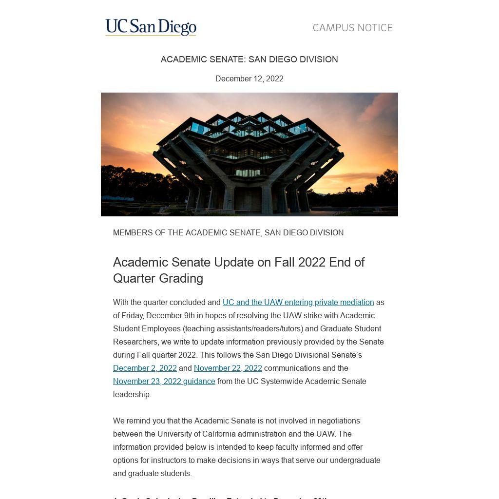With the quarter concluded and UC and the UAW entering private mediation as of Friday, December 9th in hopes of resolving the UAW strike with Academic Student Employees (teaching assistants/readers/tutors) and Graduate Student Researchers, we write to update information previously provided by the Senate during Fall quarter 2022. This follows the San Diego Divisional Senate’s December 2, 2022 and November 22, 2022 communications and the November 23, 2022 guidance from the UC Systemwide Academic Senate leadership.