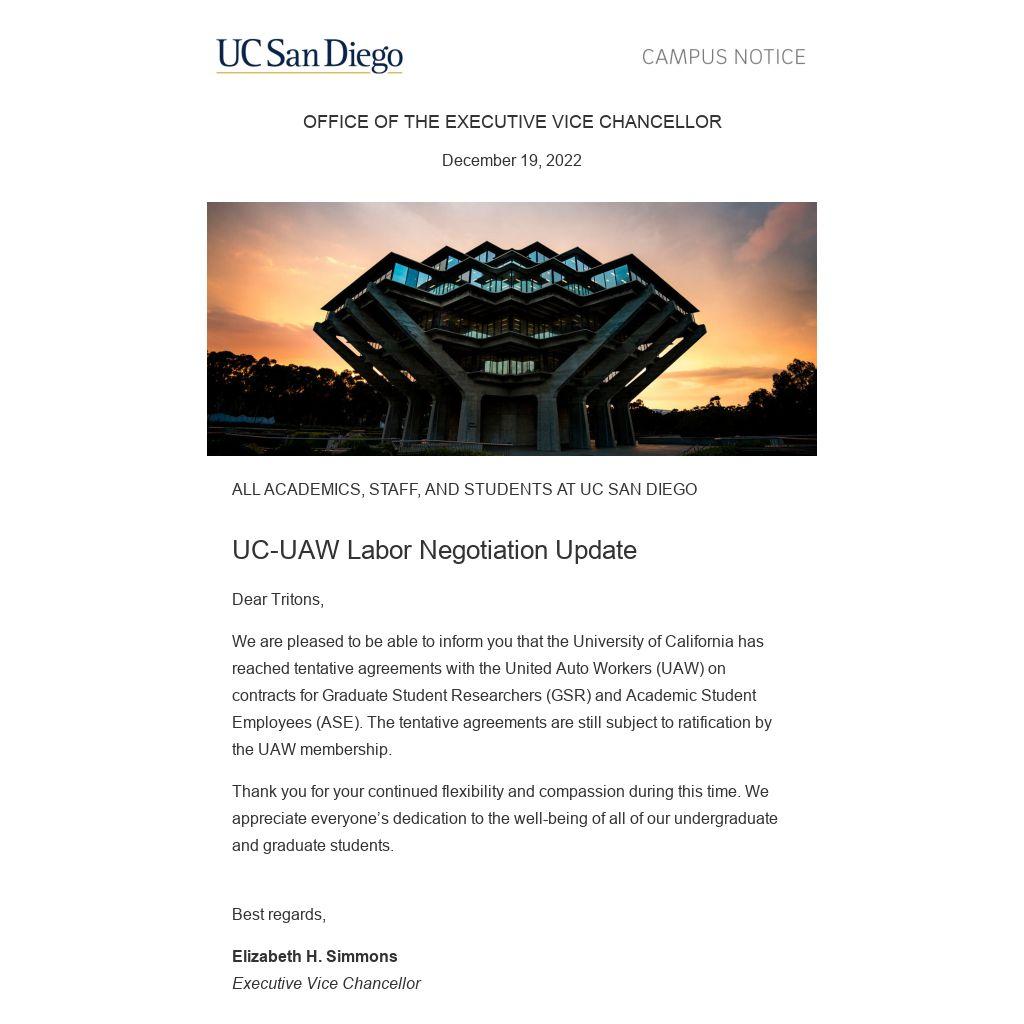 After months of negotiations, a strike, and disruptions on our campuses, I am pleased to inform you that UC has reached a tentative agreement with the United Auto Workers (UAW) regarding the Graduate Student Researchers (GSR) and Academic Student Employees (ASE) contracts. Union members are expected to vote on the tentative agreements in the coming days.