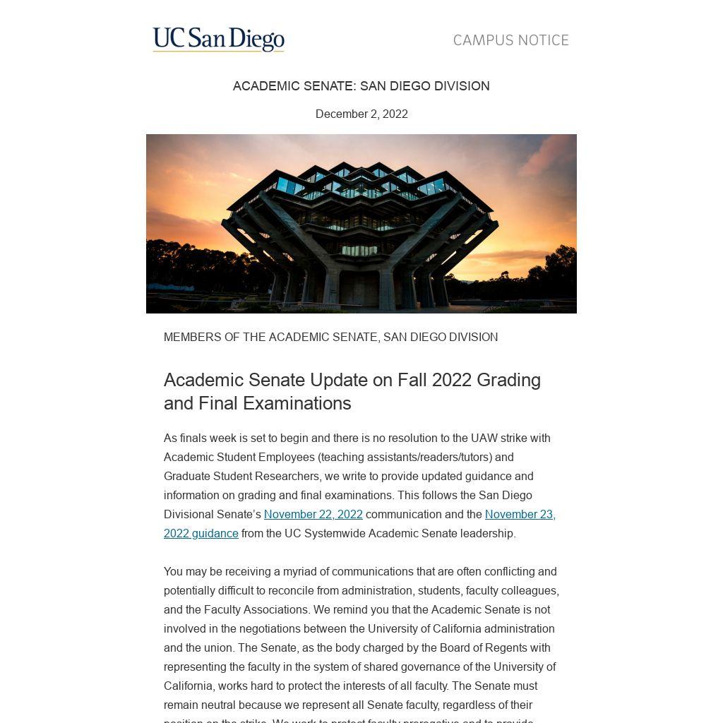 As finals week is set to begin and there is no resolution to the UAW strike with Academic Student Employees (teaching assistants/readers/tutors) and Graduate Student Researchers, we write to provide updated guidance and information on grading and final examinations. This follows the San Diego Divisional Senate’s November 22, 2022 communication and the November 23, 2022 guidance from the UC Systemwide Academic Senate leadership.