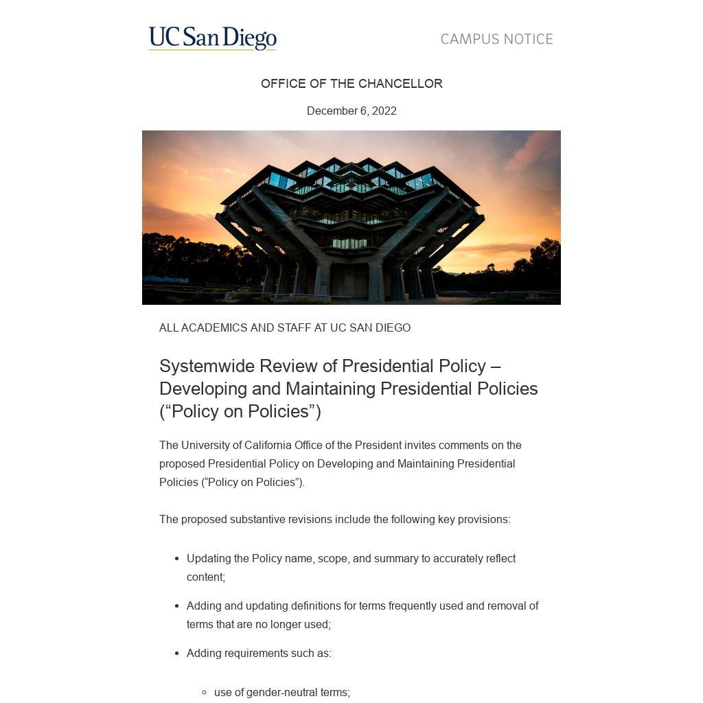 The draft policy is posted here. If you have any questions or if you wish to comment, please contact Paula Johnson in Policy and Records Administration at policy@ucsd.edu no later than February 17, 2023.
