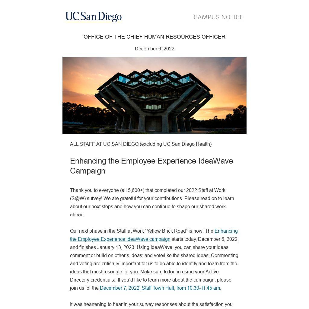 While over 5,600 of you responded to this year’s survey, we want to ensure everyone continues to have a chance to share ideas for how we can improve together. As you have heard me describe in recent Staff Town Halls, starting this year we are doing things a little differently by following up on the S@W survey with an IdeaWave campaign. We want to hear your ideas about specific ways we can work together to improve your experience around the themes identified in the S@W survey. We are organizing the IdeaWave campaign around the five anchors of the UC San Diego People Proposition, the promise we want to be able to deliver on to the people of UC San Diego - Care, Inclusion, Growth, Equity and Purpose. We want your ideas on how to enact concrete, practical steps to enhance the staff experience and deliver on that promise.