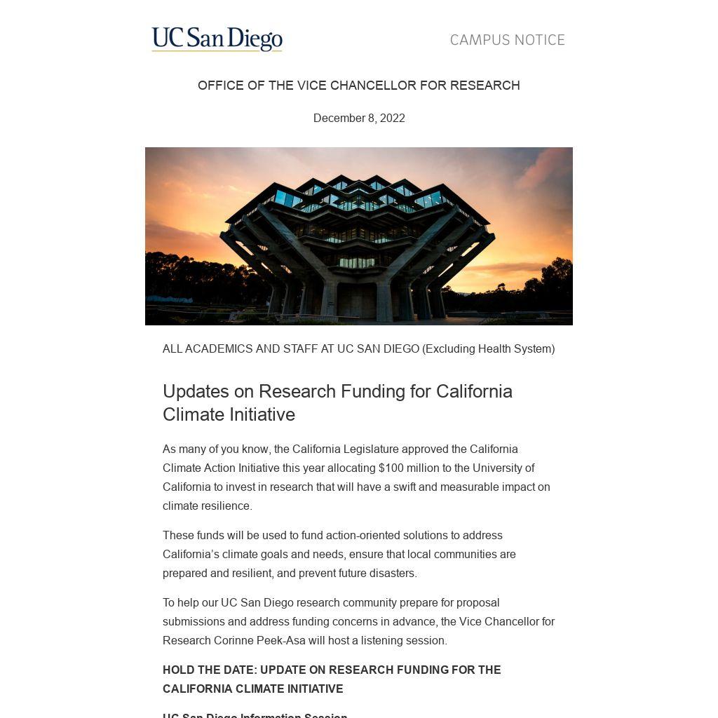 HOLD THE DATE: UPDATE ON RESEARCH FUNDING FOR THE CALIFORNIA CLIMATE INITIATIVE