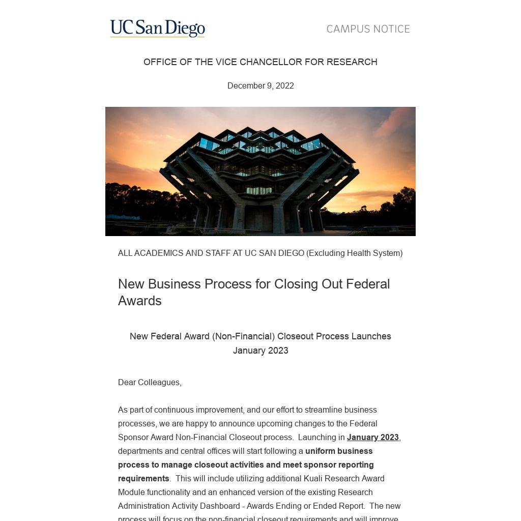 WHY THIS IS IMPORTANT While federal sponsors have had policies in place to withhold funding from PIs (and/or institutions) with delinquent awards missing required closeout documentation, they have recently started increasing the level of communication around these policies, thereby making enforcement of these policies more likely. This significantly increases the risks associated with not properly closing out awards. These notices and warnings are coming from major federal sponsors such as NSF and NIH, further increasing the potential risk to UC San Diego's research portfolio.