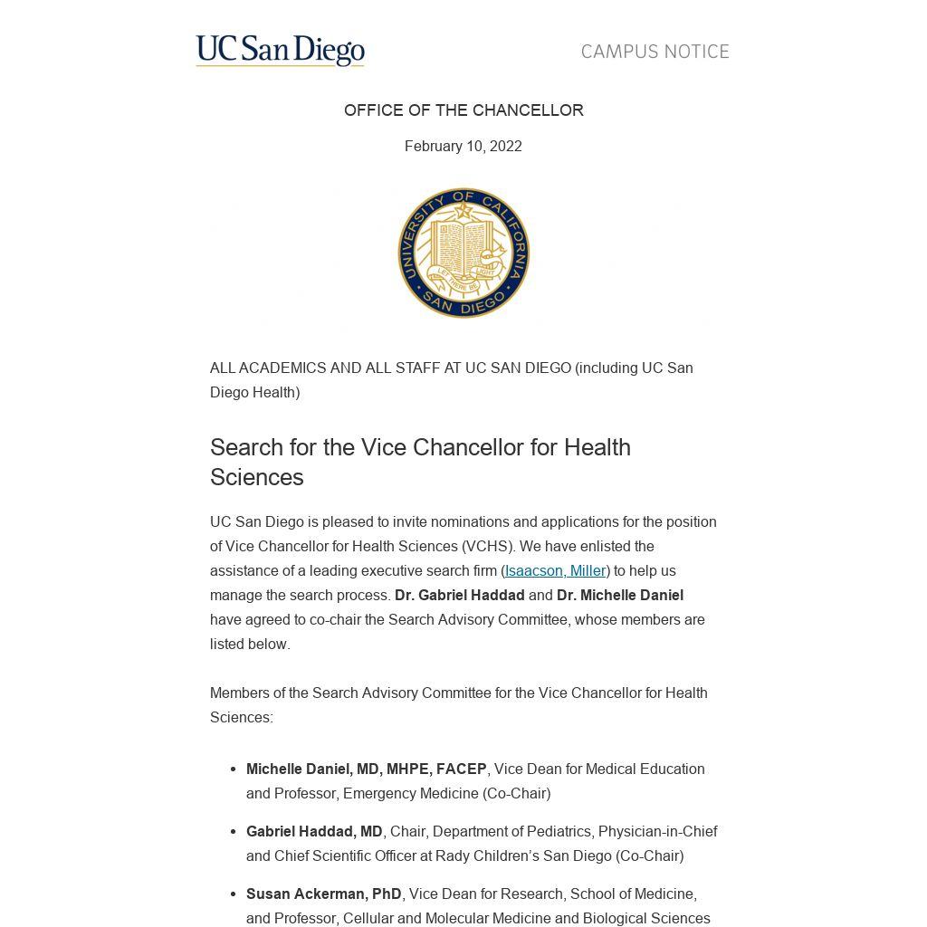 UC San Diego is pleased to invite nominations and applications for the position of Vice Chancellor for Health Sciences (VCHS). We have enlisted the assistance of a leading executive search firm (Isaacson, Miller) to help us manage the search process. Dr. Gabriel Haddad and Dr. Michelle Daniel have agreed to co-chair the Search Advisory Committee, whose members are listed below.