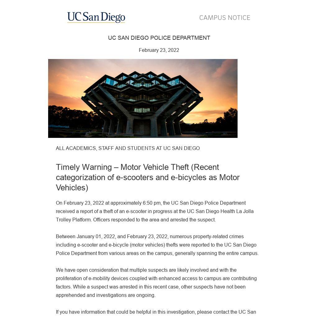 Between January 01, 2022, and February 23, 2022, numerous property-related crimes including e-scooter and e-bicycle (motor vehicles) thefts were reported to the UC San Diego Police Department from various areas on the campus, generally spanning the entire campus.