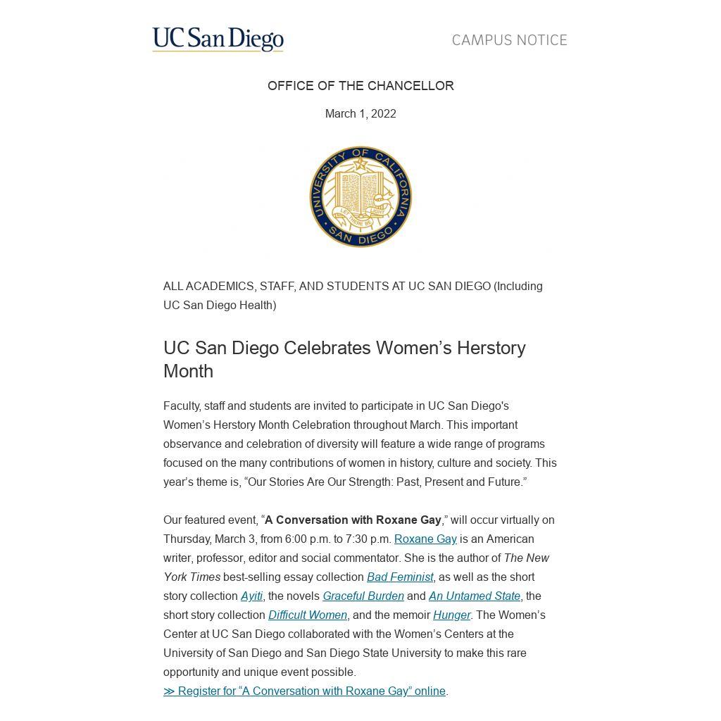 For more information on UC San Diego’s Women’s Herstory Month programs and to download a Women’s Herstory Month Zoom background, please visit the Women's Center website.