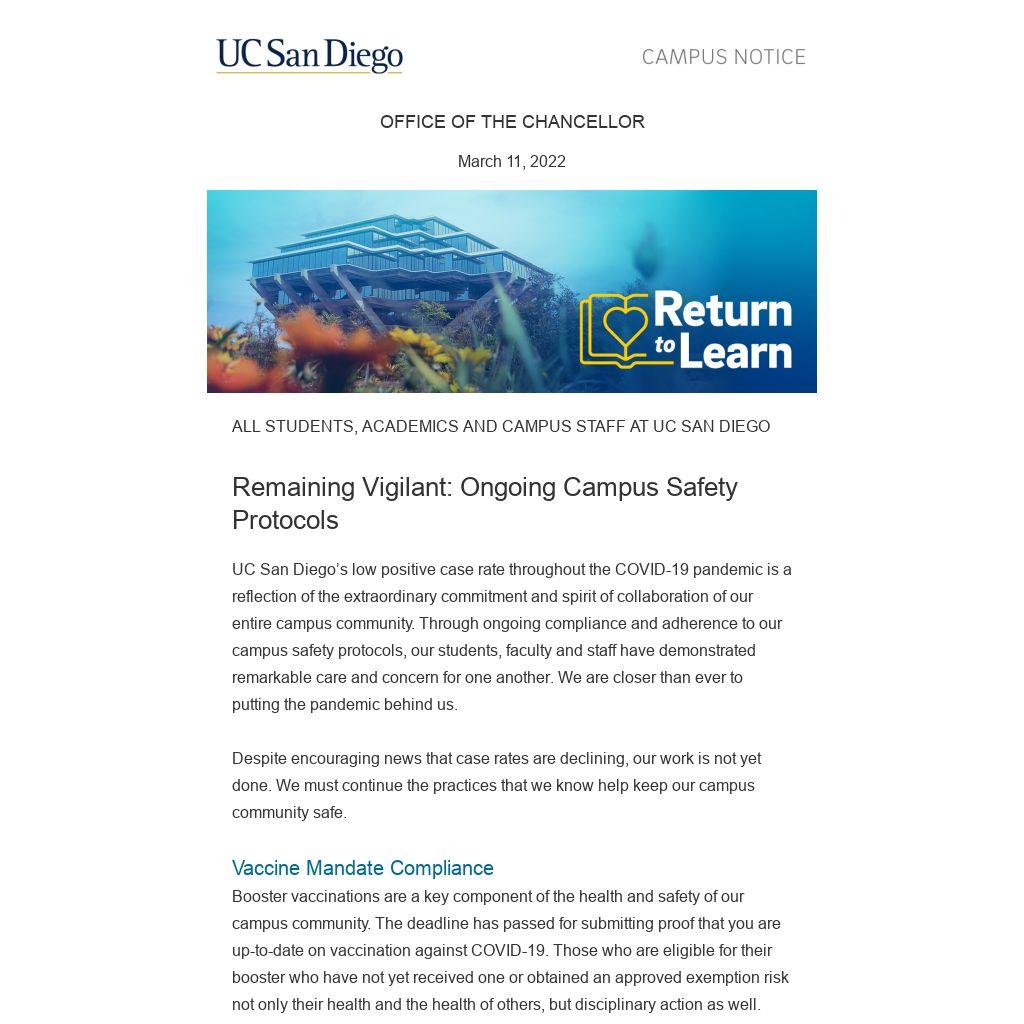 What’s Next UC San Diego is carefully considering the next phase of our approach and how to adapt and maintain the flexibility of our campus safety protocols as we move into a more endemic phase of this ongoing public health situation. We will continue to monitor and analyze the data and trust the expertise of our multidisciplinary team to identify the right time and circumstances to adjust our campus safety protocols, and will communicate any changes with speed and transparency. Information on current campus safety protocols can also be found on the Return to Learn website.