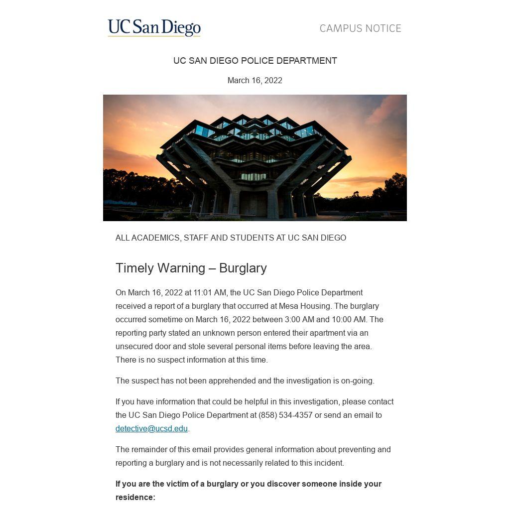 On March 16, 2022 at 11:01 AM, the UC San Diego Police Department received a report of a burglary that occurred at Mesa Housing. The burglary occurred sometime on March 16, 2022 between 3:00 AM and 10:00 AM. The reporting party stated an unknown person entered their apartment via an unsecured door and stole several personal items before leaving the area. There is no suspect information at this time.