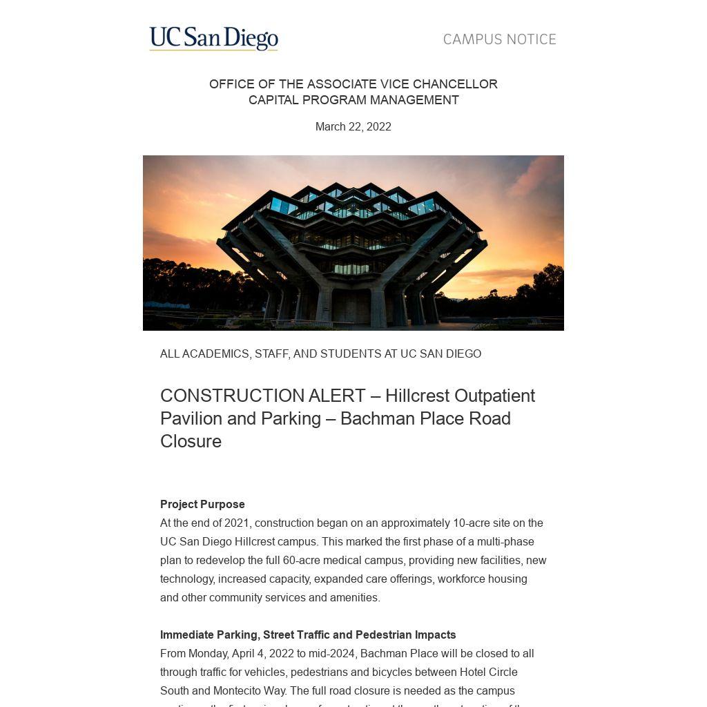 Immediate Parking, Street Traffic and Pedestrian Impacts From Monday, April 4, 2022 to mid-2024, Bachman Place will be closed to all through traffic for vehicles, pedestrians and bicycles between Hotel Circle South and Montecito Way. The full road closure is needed as the campus continues the first major phase of construction at the southeast portion of the Hillcrest campus by building the new parking structure. During the closure, access to the Bachman parking structure will be maintained for UC San Diego staff by traveling south on Bachman Place from Hotel Circle South (noting access from the south will not be available).