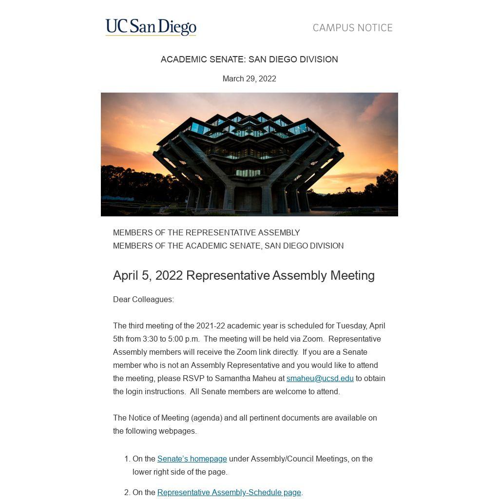 Chancellor Khosla will address the Assembly at this meeting and Dean of the Undergraduate Division John Moore and Warren College Provost Marisa Abrajano will provide an update on implementation plans for holistic teaching evaluation. The following consent items will be presented: Senate election nominations and 2021-22 Distinguished Teaching Awards. The following proposals will be presented: