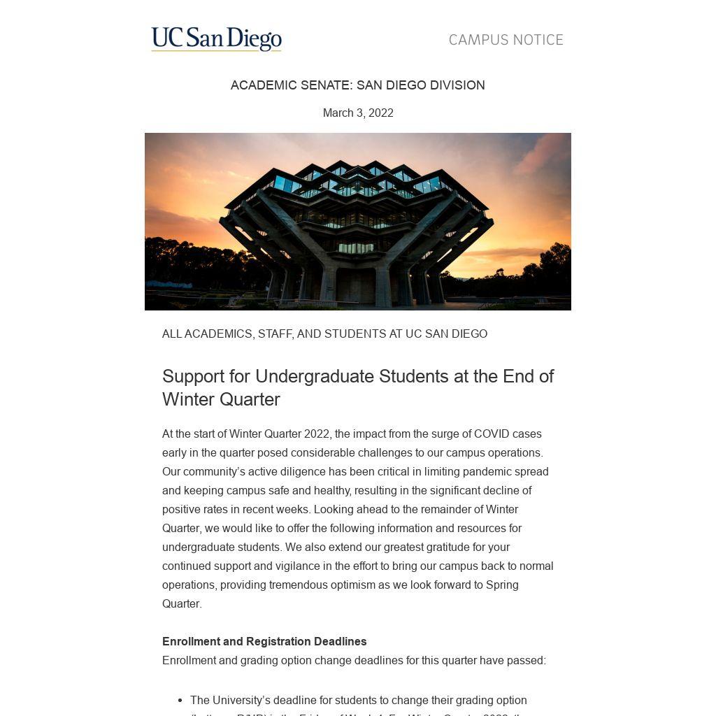 At the start of Winter Quarter 2022, the impact from the surge of COVID cases early in the quarter posed considerable challenges to our campus operations. Our community’s active diligence has been critical in limiting pandemic spread and keeping campus safe and healthy, resulting in the significant decline of positive rates in recent weeks. Looking ahead to the remainder of Winter Quarter, we would like to offer the following information and resources for undergraduate students. We also extend our greatest gratitude for your continued support and vigilance in the effort to bring our campus back to normal operations, providing tremendous optimism as we look forward to Spring Quarter.