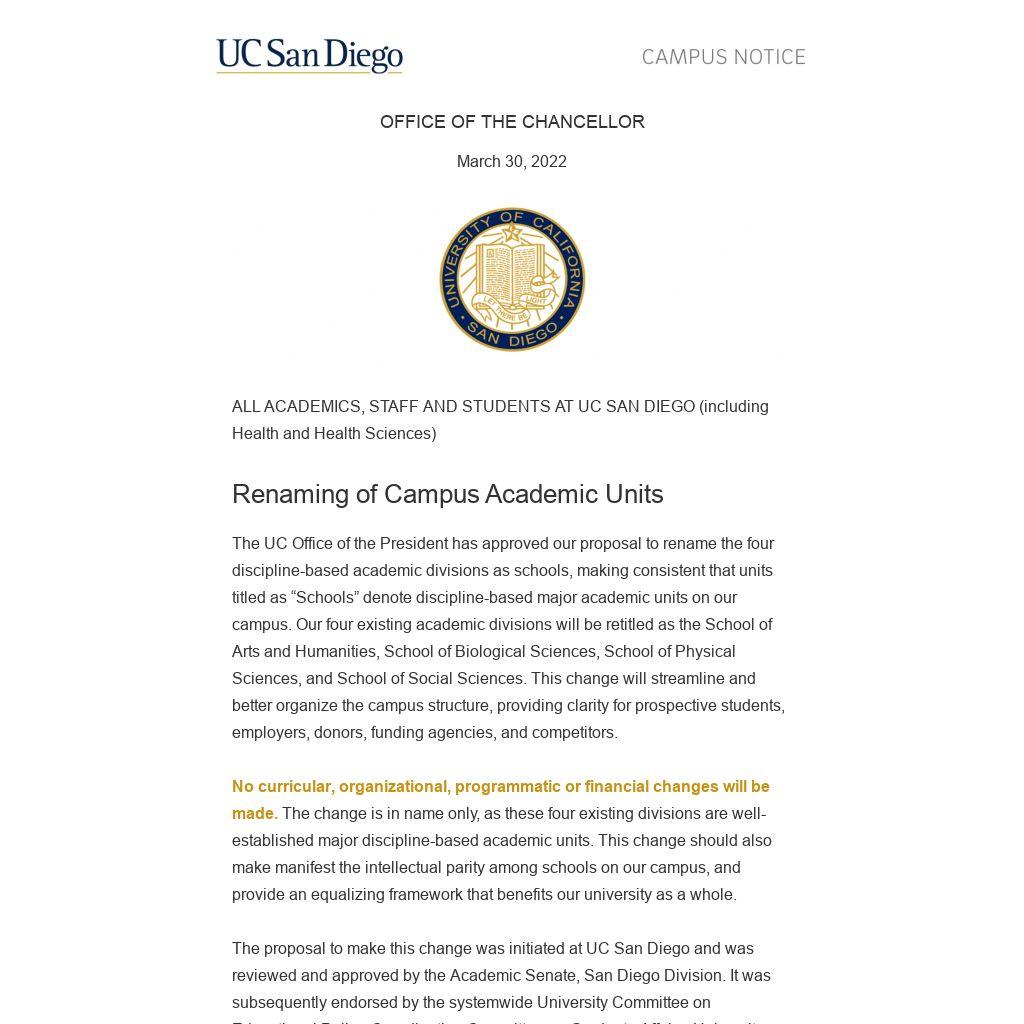 Thank you for embracing this change for the betterment of our university and the greater UC San Diego community.