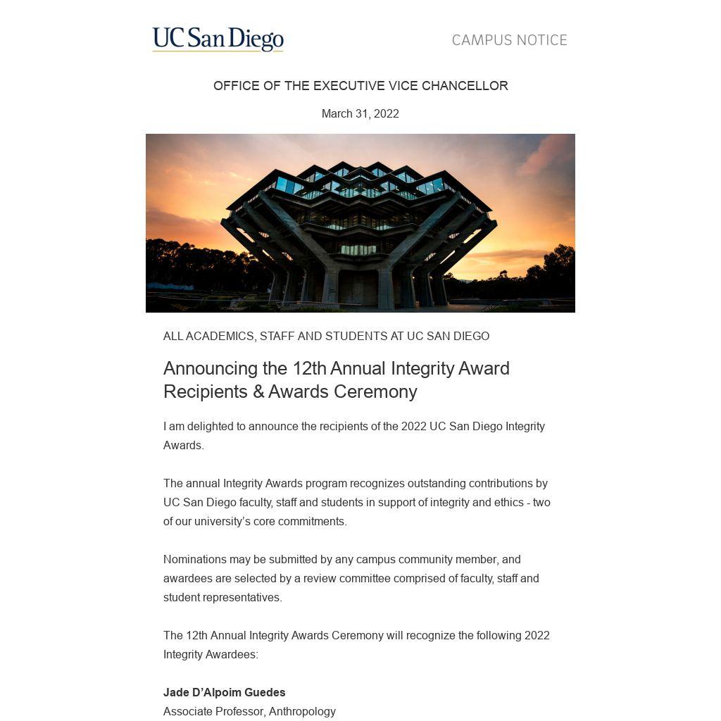 I am delighted to announce the recipients of the 2022 UC San Diego Integrity Awards.