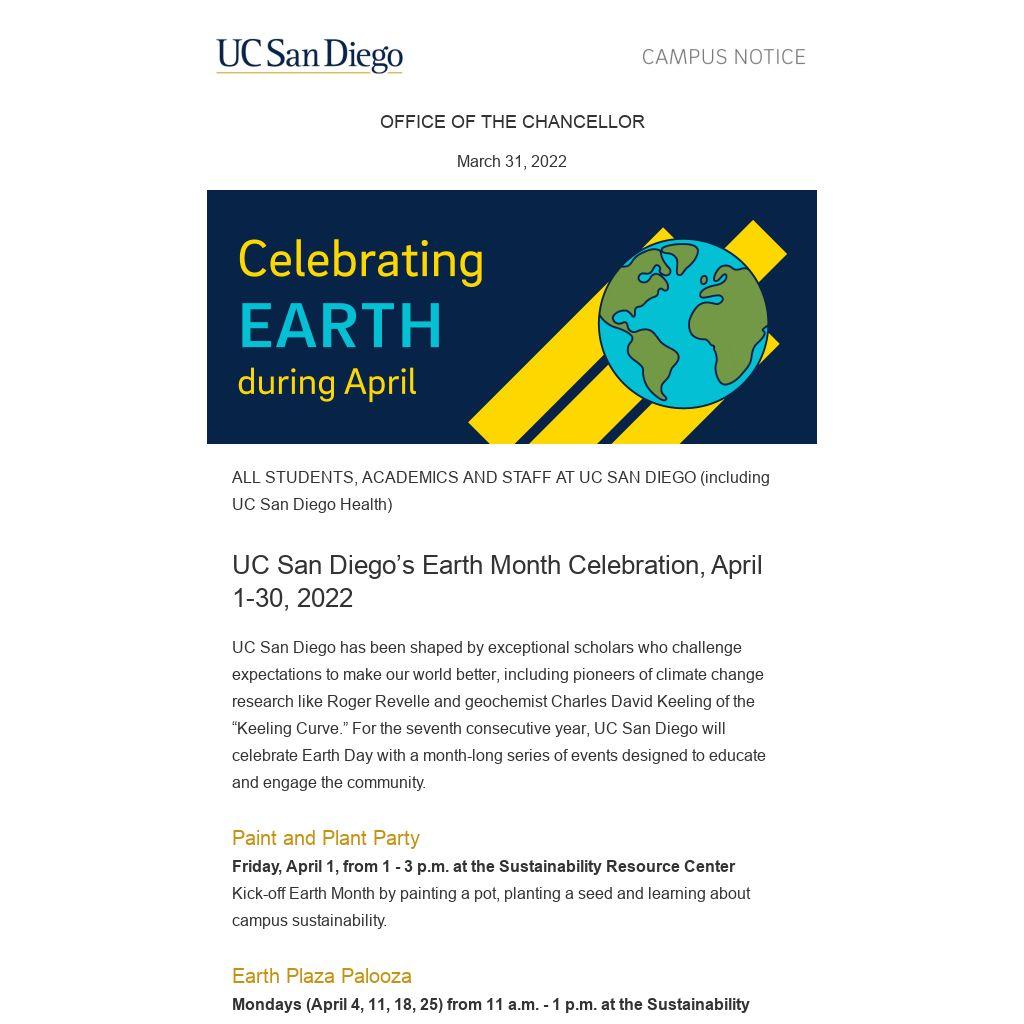 UC San Diego’s Earth Month Celebration, April 1-30, 2022 | |