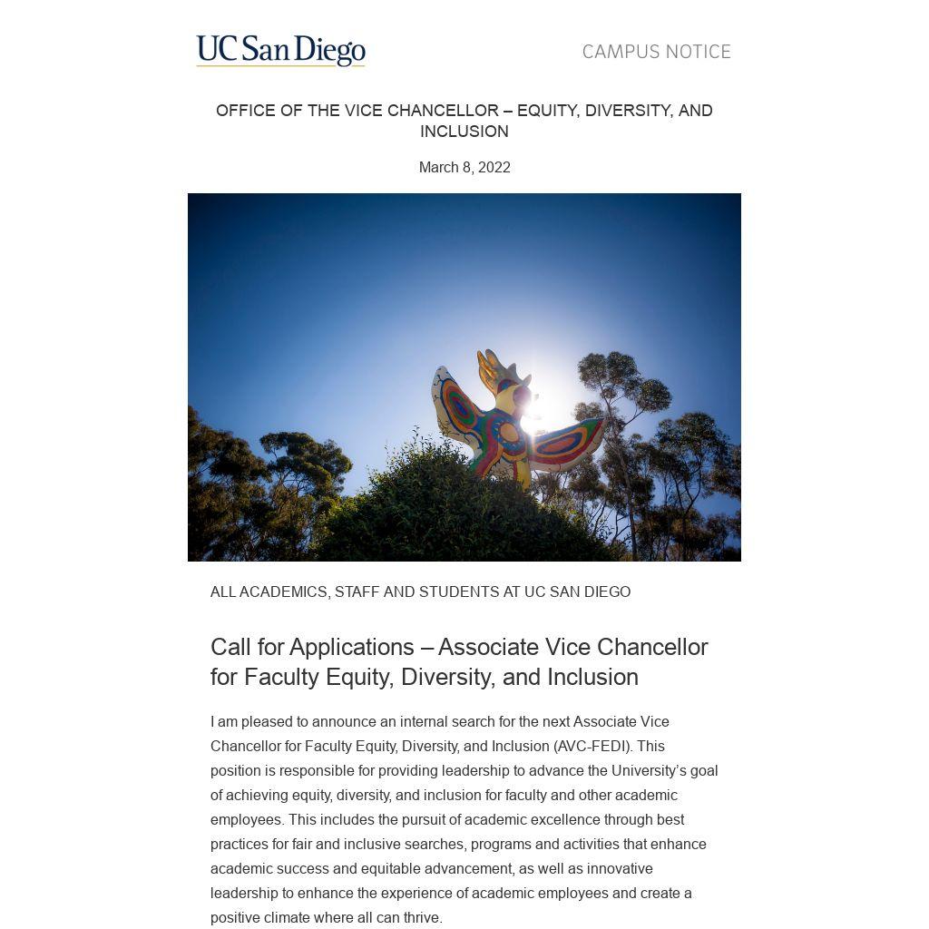 I am pleased to announce an internal search for the next Associate Vice Chancellor for Faculty Equity, Diversity, and Inclusion (AVC-FEDI). This position is responsible for providing leadership to advance the University’s goal of achieving equity, diversity, and inclusion for faculty and other academic employees. This includes the pursuit of academic excellence through best practices for fair and inclusive searches, programs and activities that enhance academic success and equitable advancement, as well as innovative leadership to enhance the experience of academic employees and create a positive climate where all can thrive.