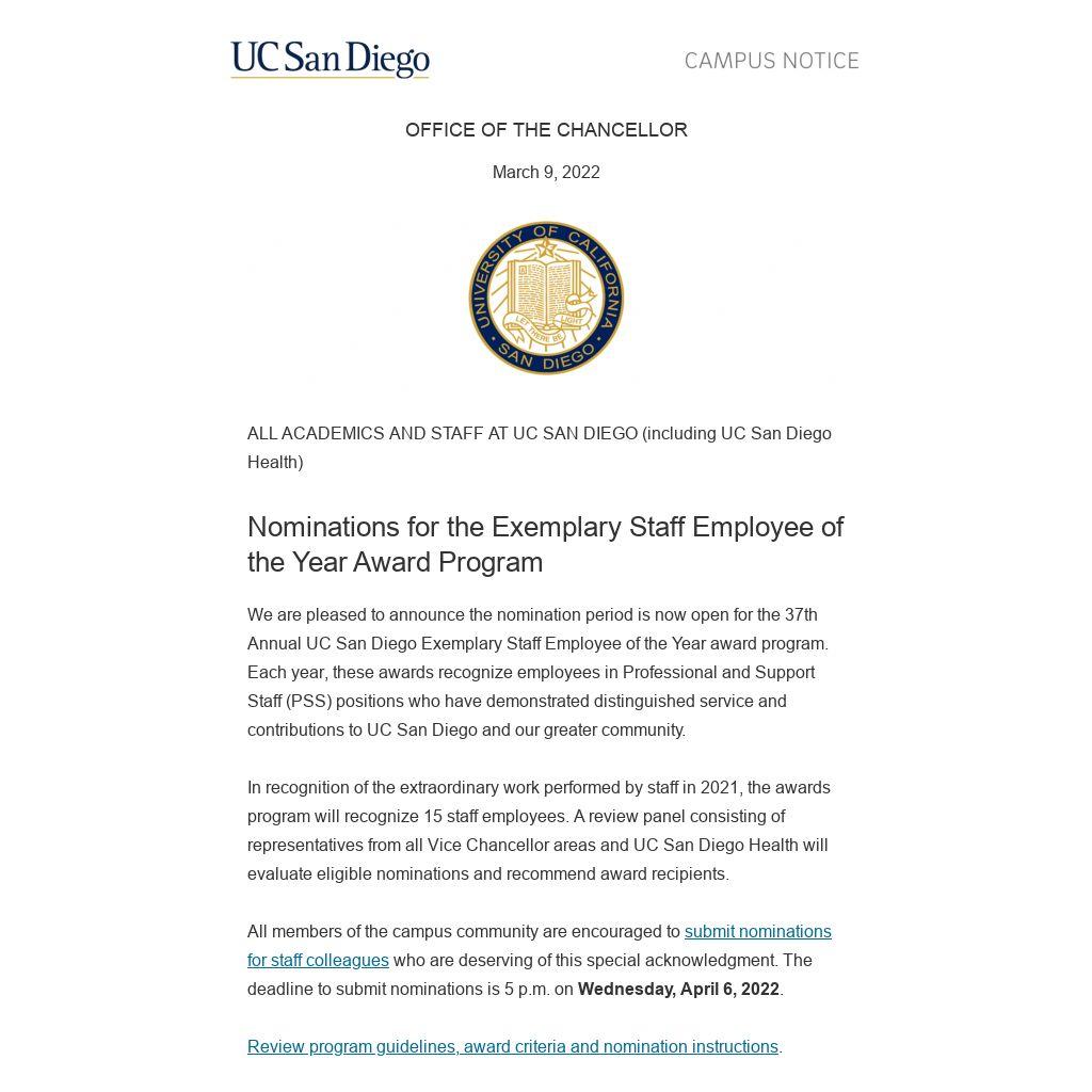 We are pleased to announce the nomination period is now open for the 37th Annual UC San Diego Exemplary Staff Employee of the Year award program. Each year, these awards recognize employees in Professional and Support Staff (PSS) positions who have demonstrated distinguished service and contributions to UC San Diego and our greater community.