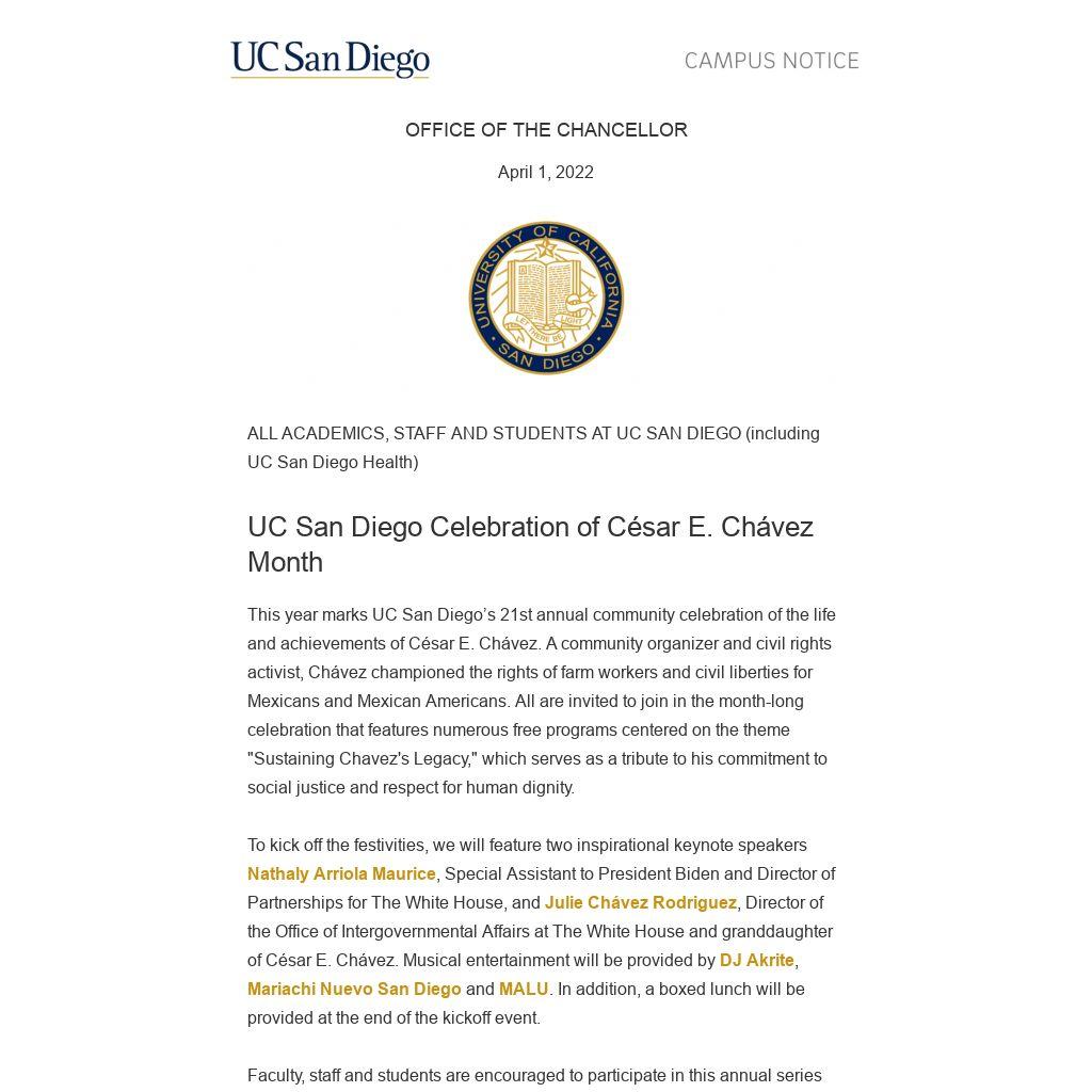 In recognition of this annual event, two hours of administrative leave with pay have been approved for employees to attend a UC San Diego César E. Chávez Celebration event. Supervisors, upon request, may approve the use of such leave when the absence does not infringe upon the performance of required job duties or patient care.