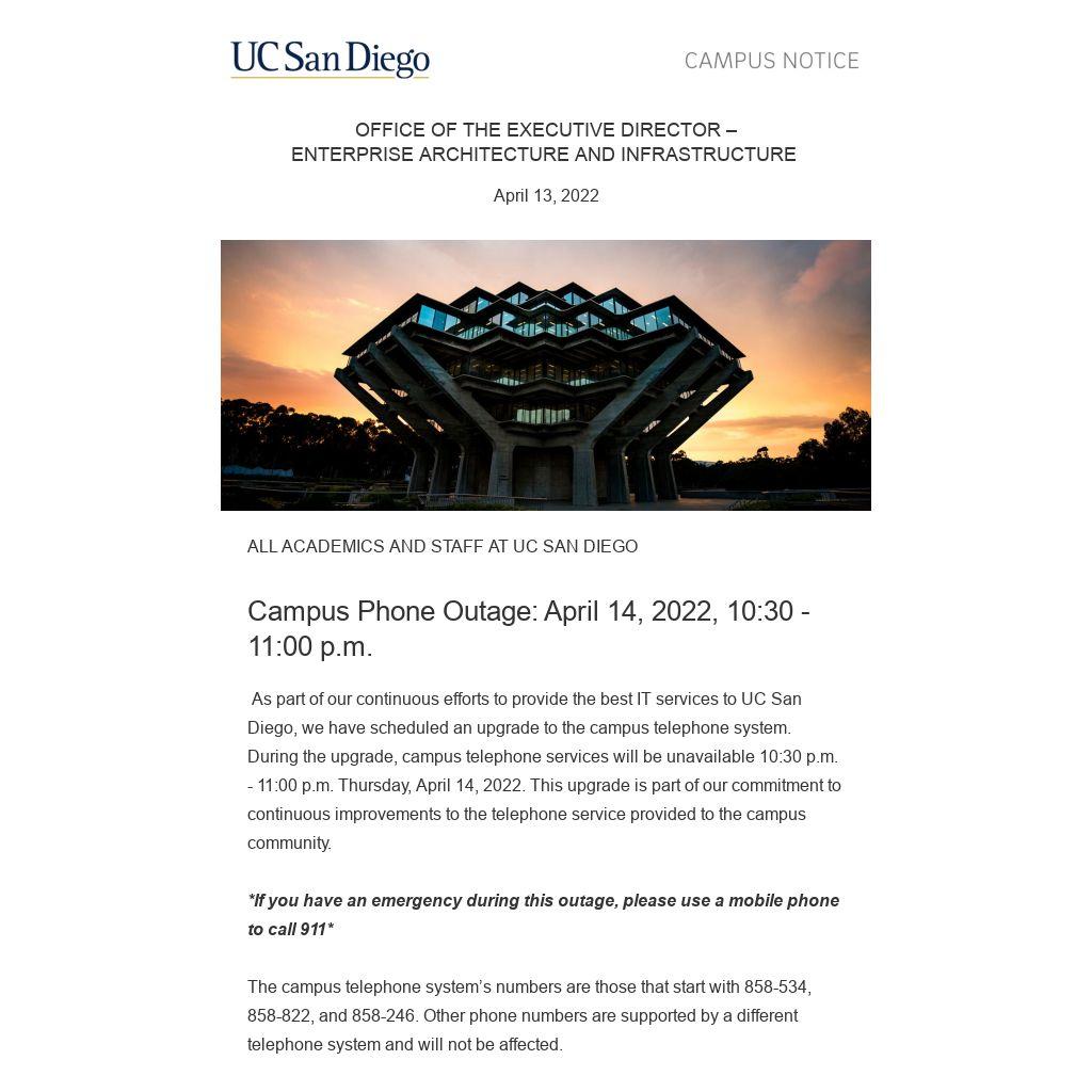 As part of our continuous efforts to provide the best IT services to UC San Diego, we have scheduled an upgrade to the campus telephone system. During the upgrade, campus telephone services will be unavailable 10:30 p.m. - 11:00 p.m. Thursday, April 14, 2022. This upgrade is part of our commitment to continuous improvements to the telephone service provided to the campus community.