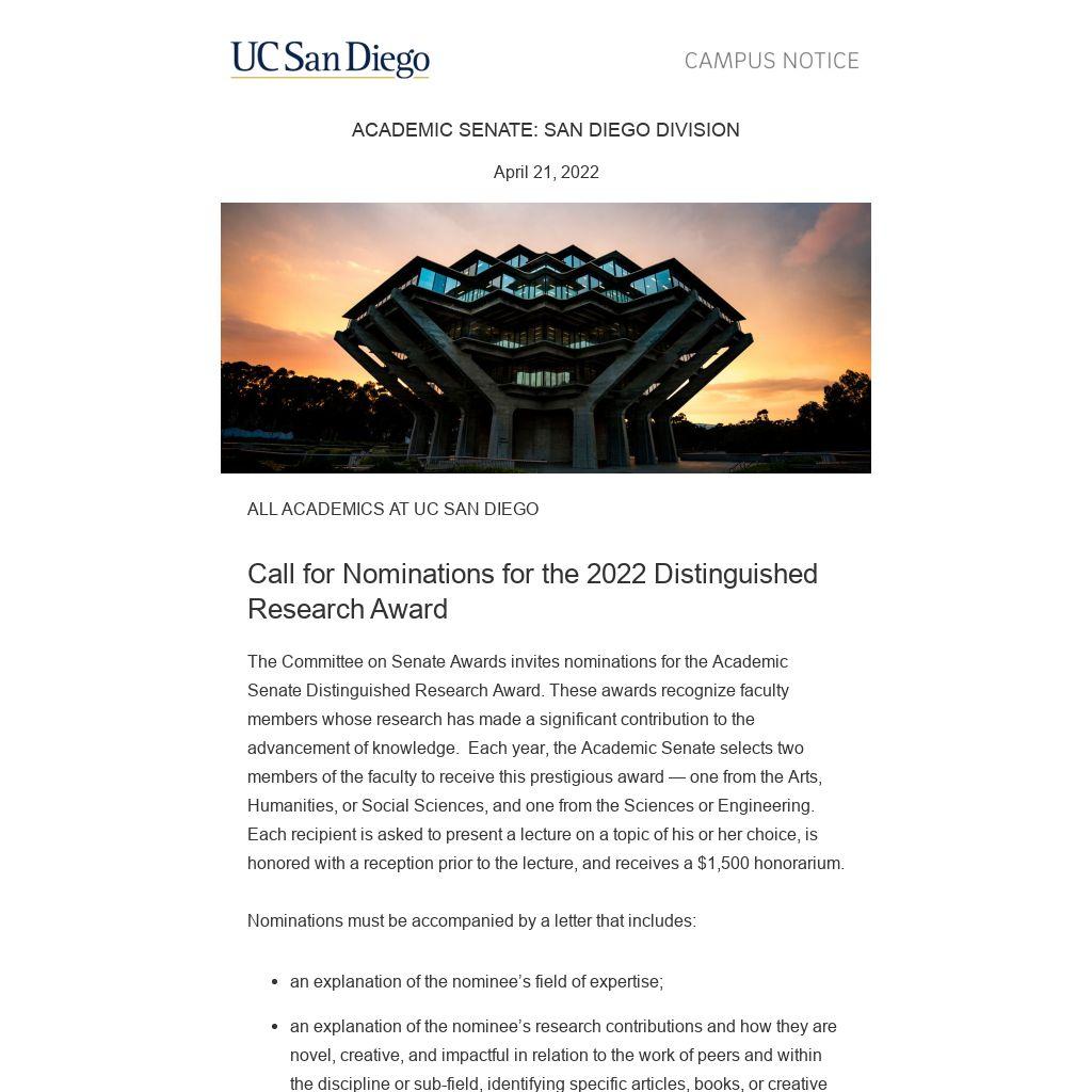 The Committee on Senate Awards invites nominations for the Academic Senate Distinguished Research Award. These awards recognize faculty members whose research has made a significant contribution to the advancement of knowledge. Each year, the Academic Senate selects two members of the faculty to receive this prestigious award — one from the Arts, Humanities, or Social Sciences, and one from the Sciences or Engineering. Each recipient is asked to present a lecture on a topic of his or her choice, is honored with a reception prior to the lecture, and receives a $1,500 honorarium.