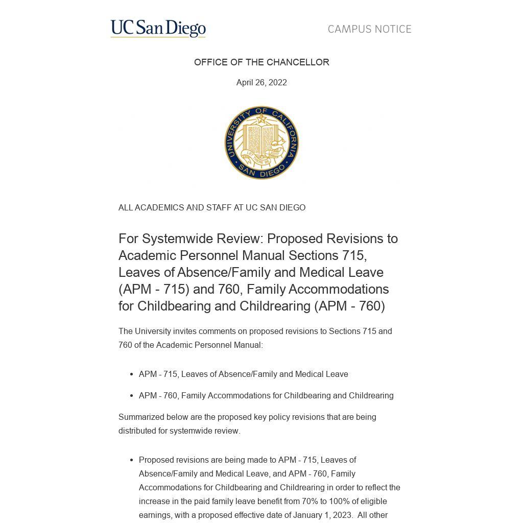 Proposed revisions are being made to APM - 715, Leaves of Absence/Family and Medical Leave, and APM - 760, Family Accommodations for Childbearing and Childrearing in order to reflect the increase in the paid family leave benefit from 70% to 100% of eligible earnings, with a proposed effective date of January 1, 2023. All other aspects of the policies will remain the same.