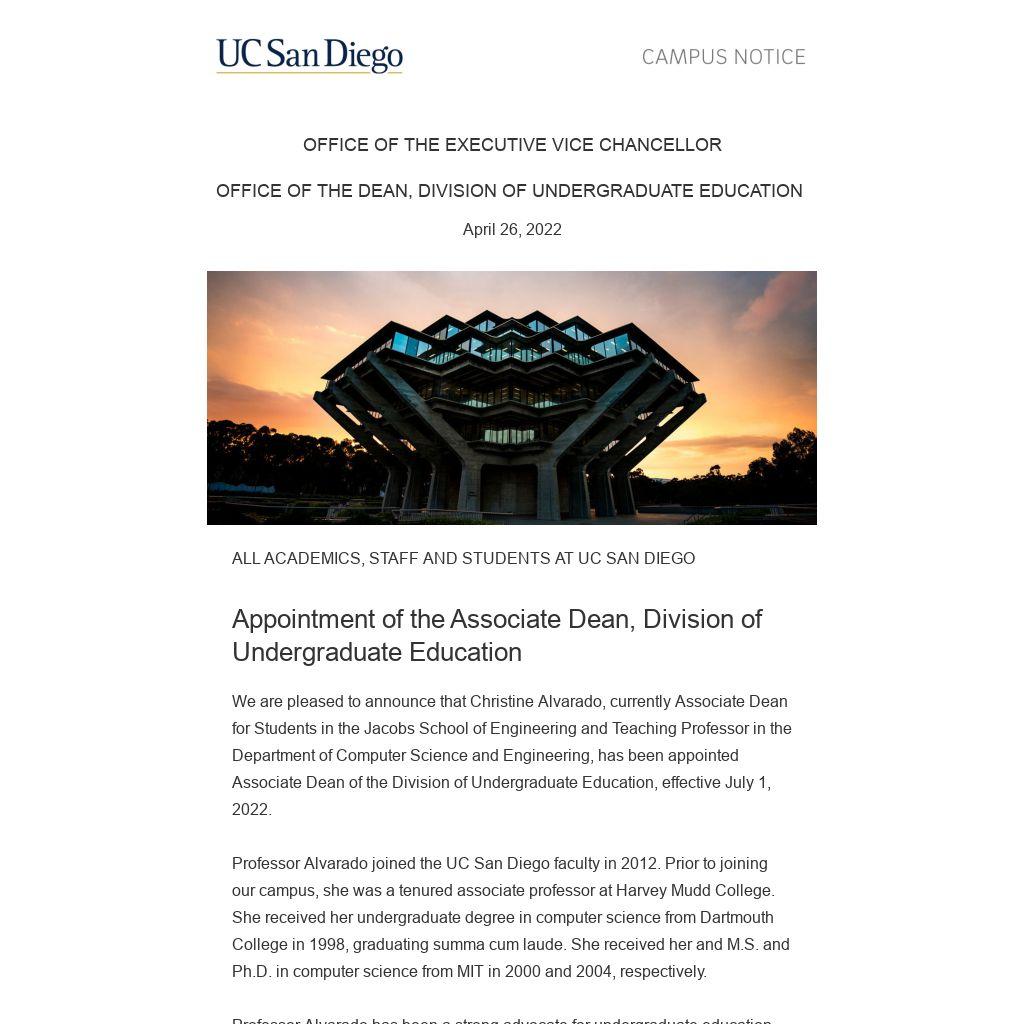 We are pleased to announce that Christine Alvarado, currently Associate Dean for Students in the Jacobs School of Engineering and Teaching Professor in the Department of Computer Science and Engineering, has been appointed Associate Dean of the Division of Undergraduate Education, effective July 1, 2022.