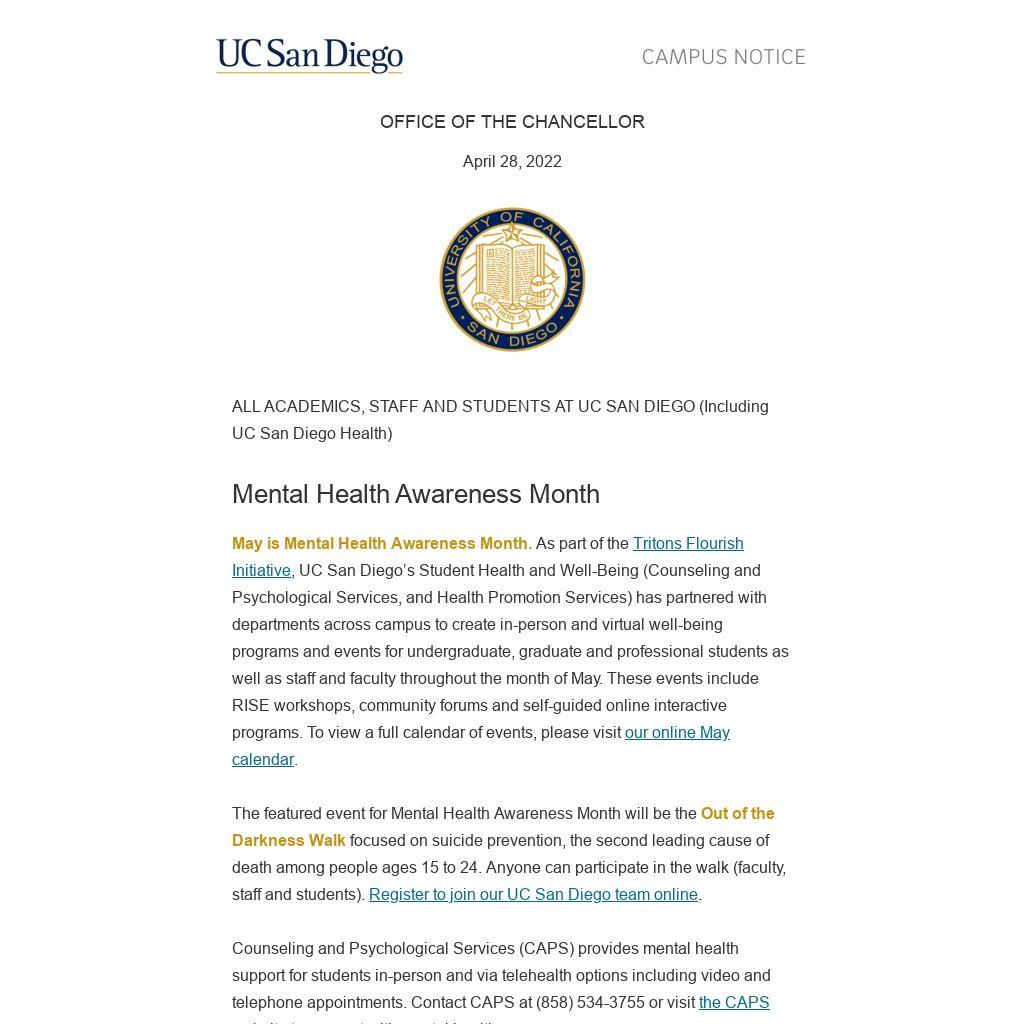 UC San Diego is committed to promoting the mental health and well-being of all students and employees, and to creating a community where all of us can flourish.