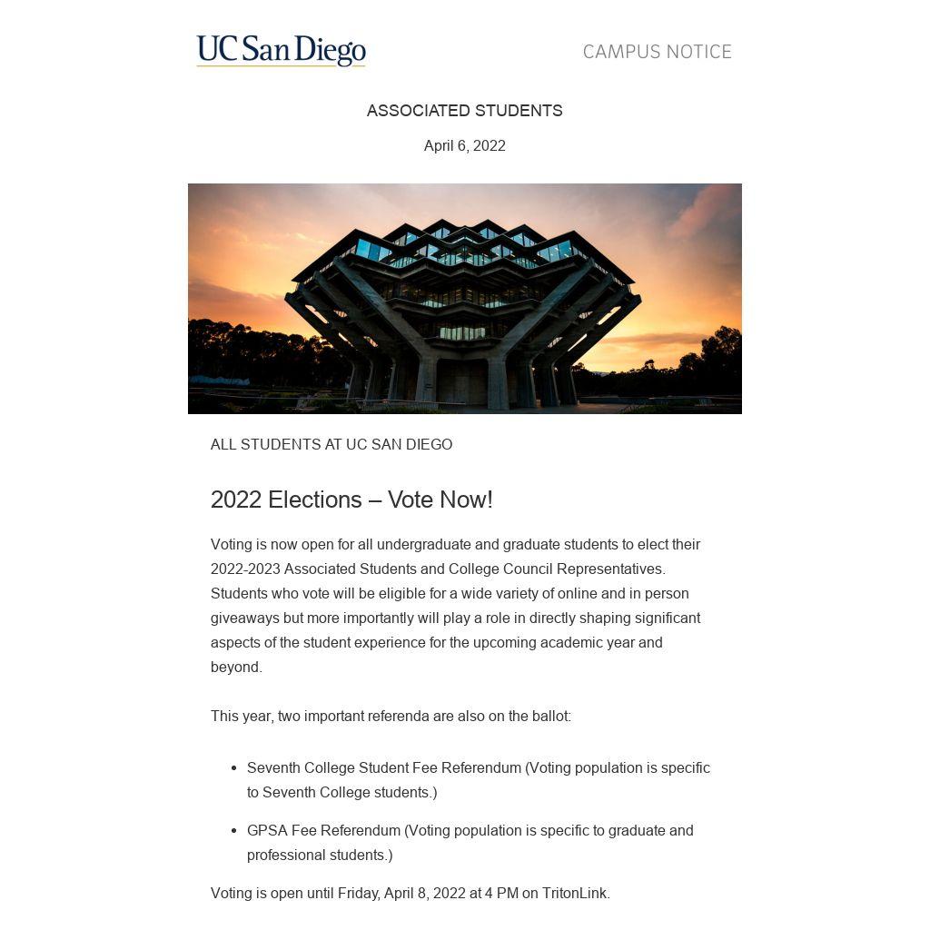 Voting is open until Friday, April 8, 2022 at 4 PM on TritonLink.